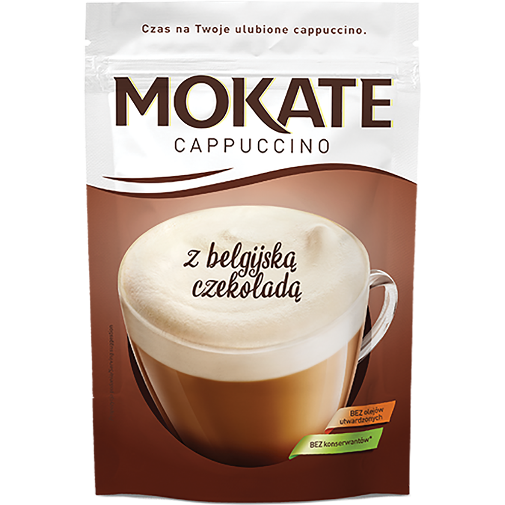 Polski Mokate cappuccino to napój kawowy w proszku o smaku czekoladowym. Niepowtarzalny smak cappuccino w połączeniu z belgijską czekoladą.
